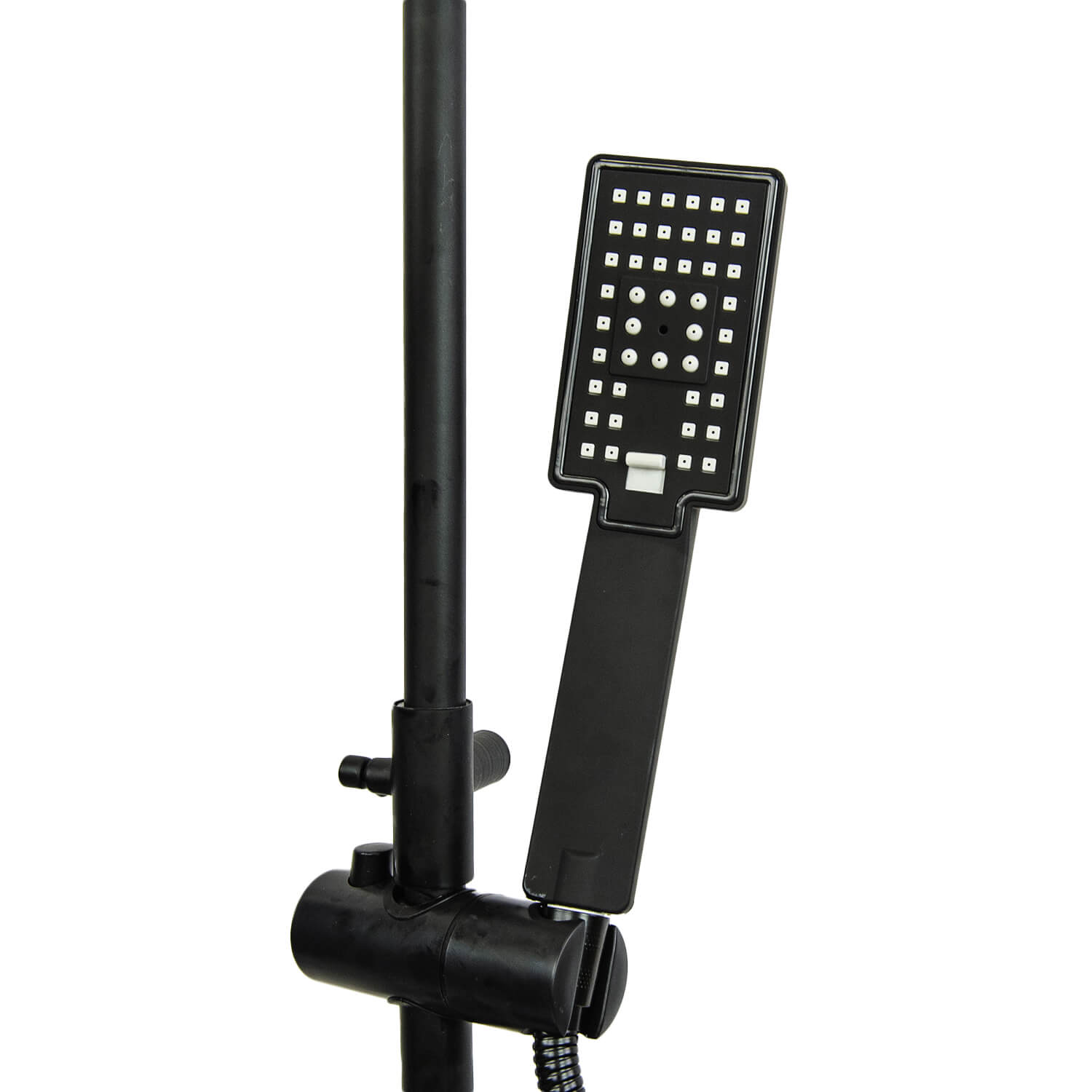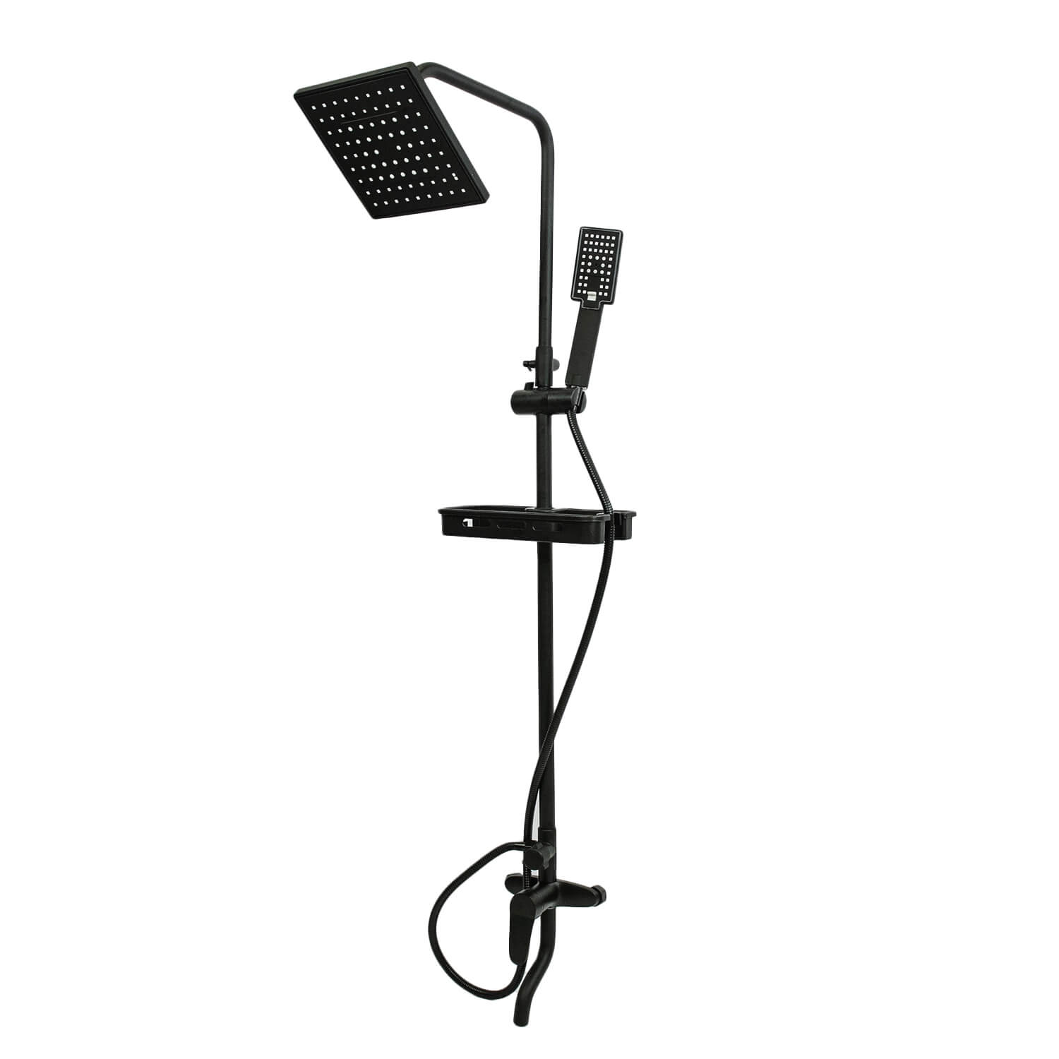 Душевой комплект с тропическим душем Quadro черный матовый предназначен для ванной или для душевой кабины в квартире или частном доме. Система тропический душ монтируется на стену и выглядит как металлическая стойка с матовым покрытием, оснащенная небольшим пластиковым контейнером для шампуней, мыла, мочалки и других предметов. Высота лейки достигает 225 мм. Верхний душ имеет квадратную форму и оснащен регулятором струи в трех режимах, при которых вода распыляется по-разному. Смеситель с изливом поворотным управляется рычажным способом. В комплект входят душевая система, штанга, пластиковая емкость и крепежные элементы.
