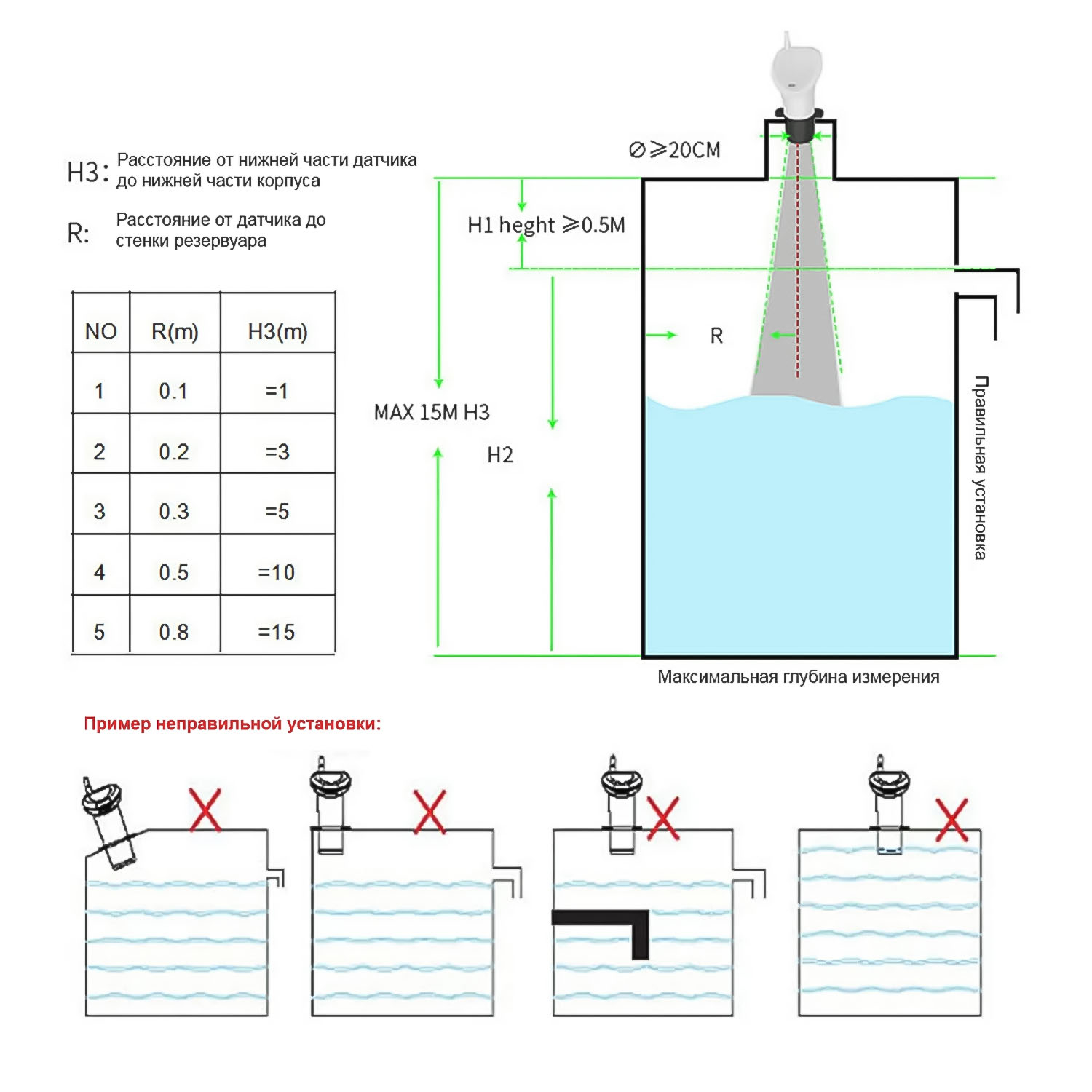 При установке датчика нужно держаться расстояния не менее 0,5 м от поверхности воды.